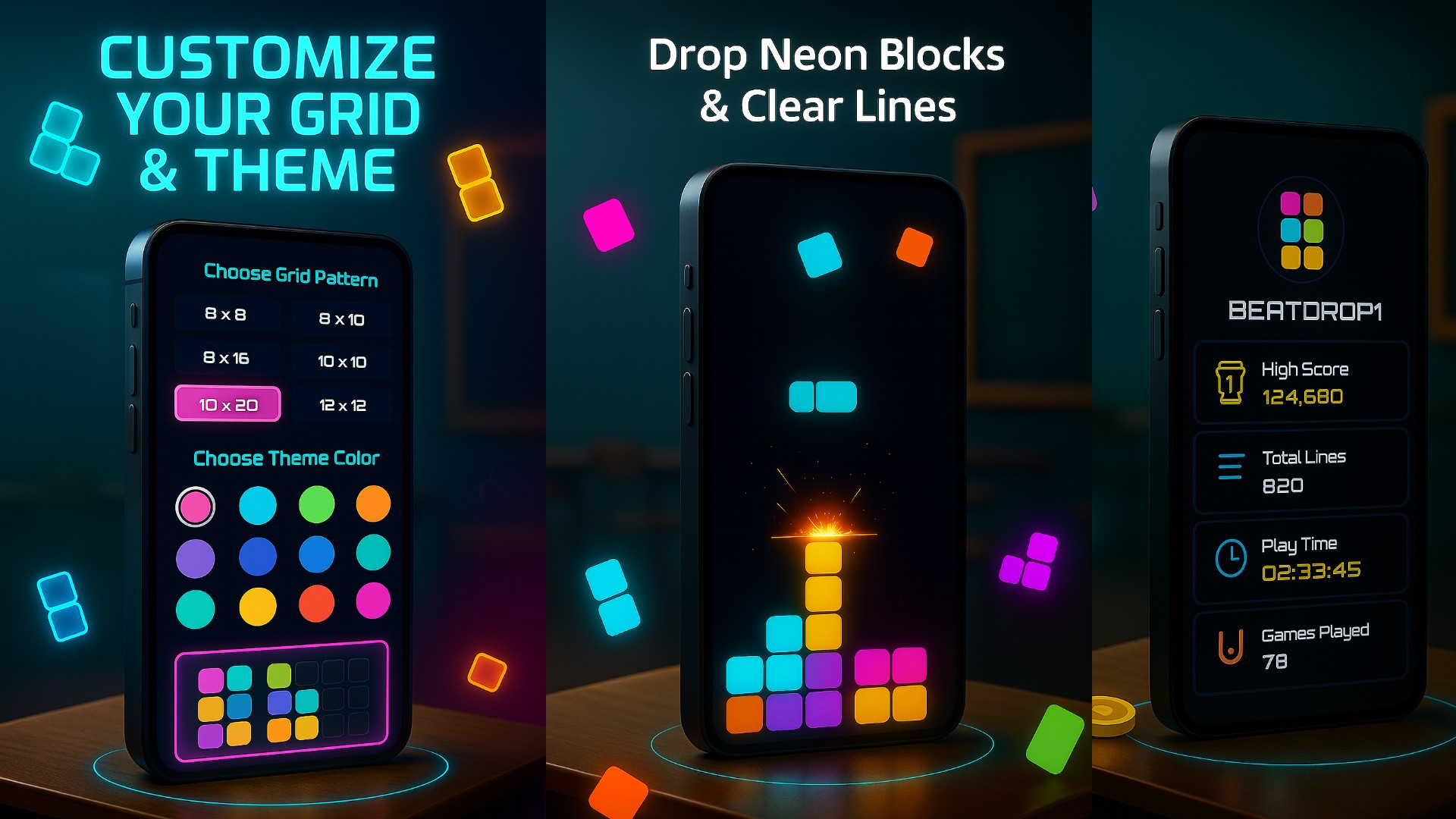 BEATDROPS is a modern, rhythm-infused block blast puzzle game that reimagines the classic block-clearing experience with a vibrant neon aesthetic and an emphasis on timing, combo chains, and progression. Its unique Rhythm BEATDROP Mode ties successful moves to the game’s energizing soundtrack, creating a high-score chase that demands both strategy and musical synchronization.
