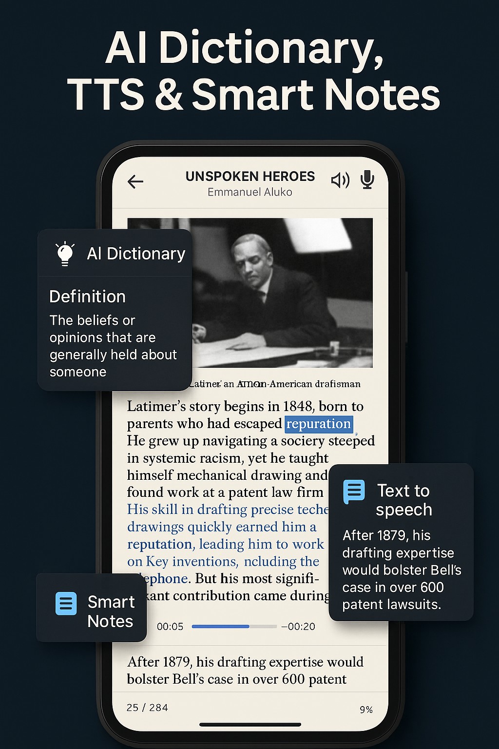 Audiobooks: Full-featured audio player with speed control, sleep timer, and bookmarking.