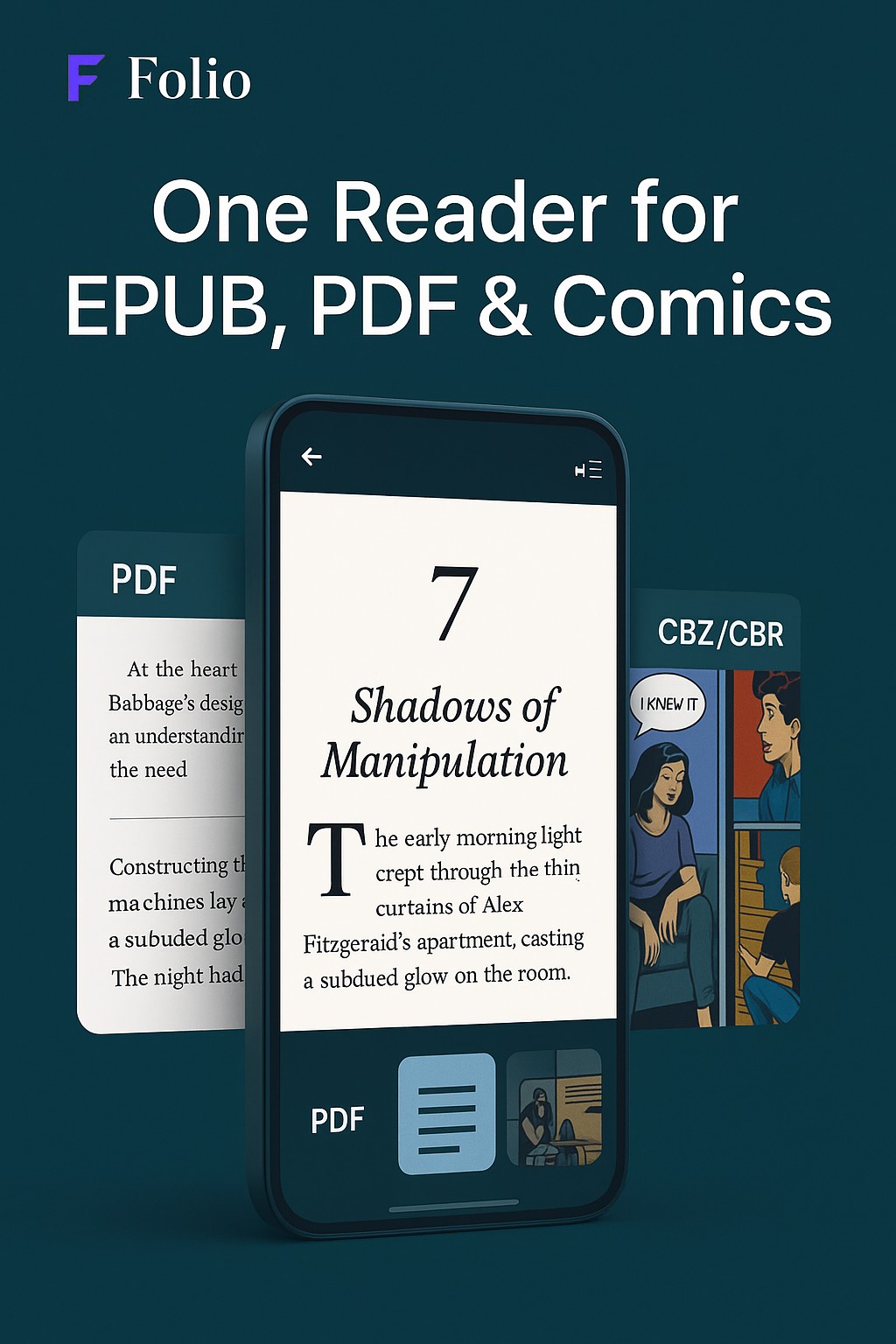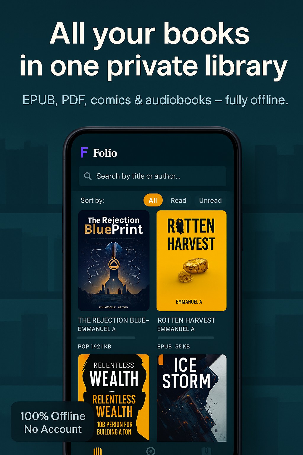 Unify your digital reading life in one beautiful, private interface. Folio supports all your favorite formats including EPUB, PDF, Comics (CBZ/CBR), and Audiobooks (MP3/M4B) without requiring an account or internet connection.