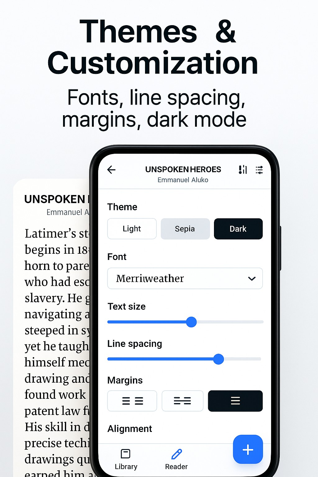 Typography: Support for custom fonts, including OpenDyslexic, line height, and margins.