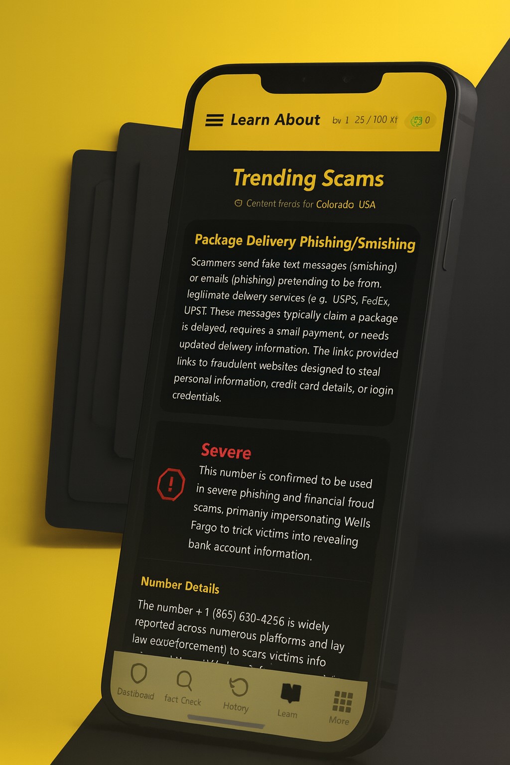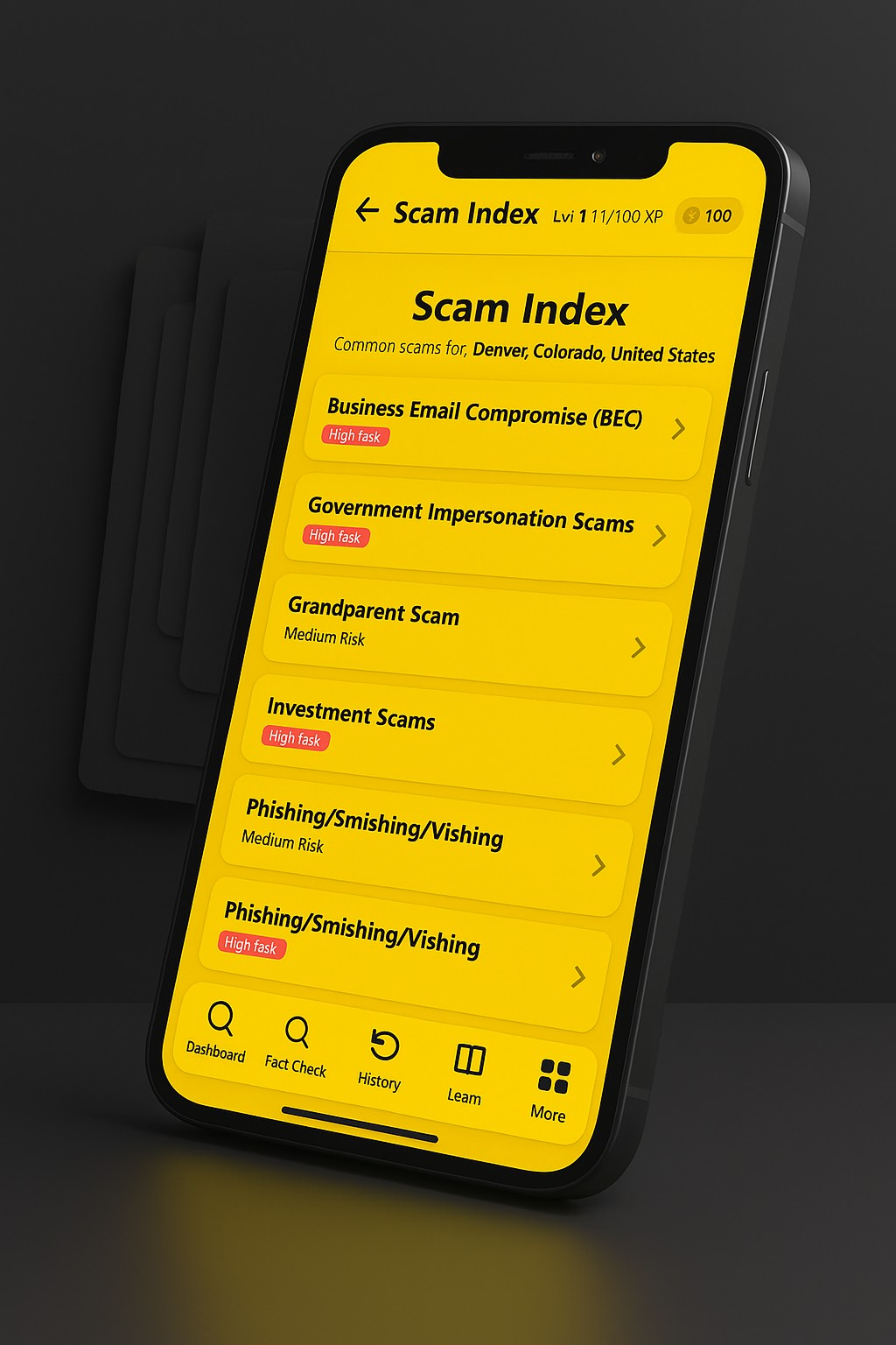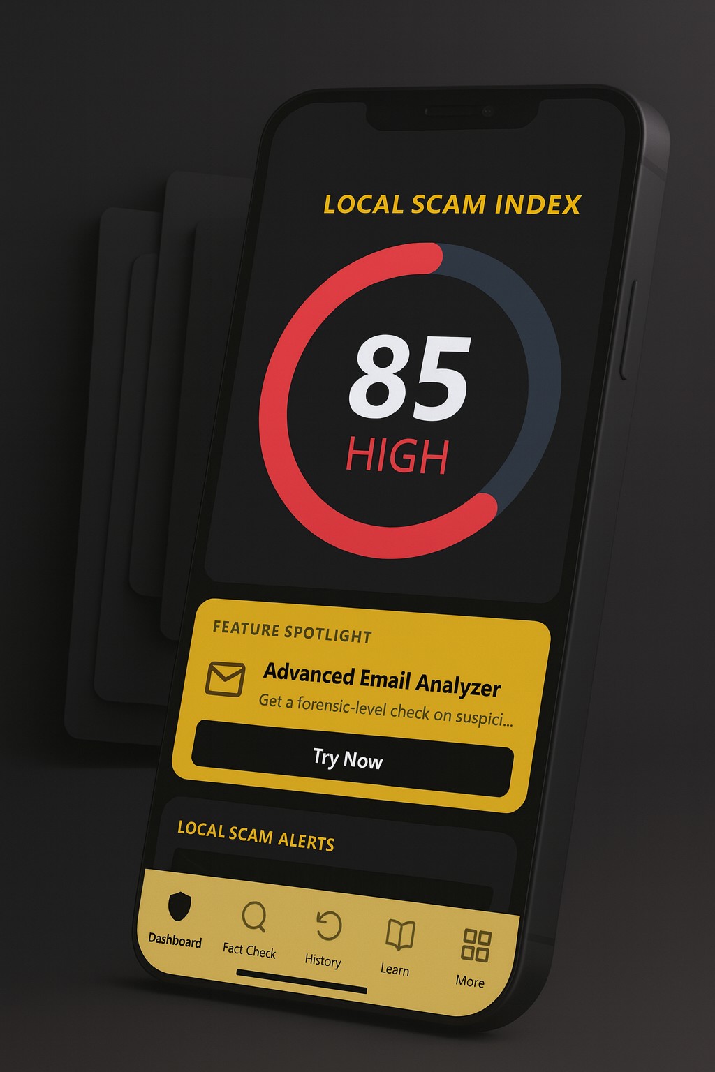 Learning: Features a Learn Screen for trending local scams and Educational Quizzes for scenario-based practice.