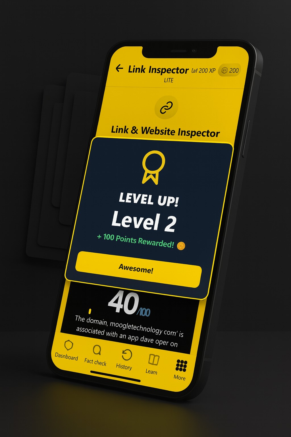 Gamification: Encourages use with XP & Leveling (points for scans/quizzes), Achievements & Badges (e.g., “Scam Slayer”), and animated UI.